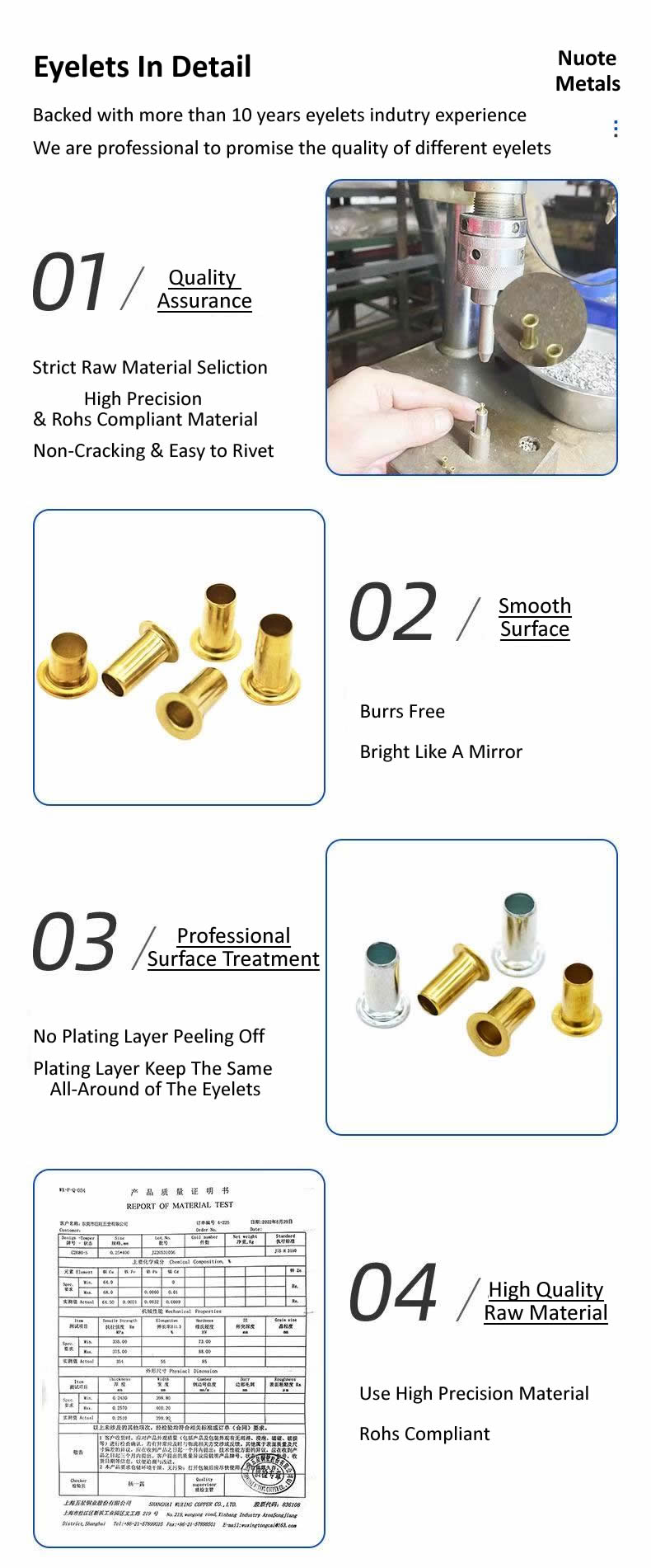 ติดต่อ Nuote Metals วันนี้เพื่อขอชุดตัวอย่างหรือข้อกำหนดโดยละเอียดในรูปแบบ PDF สำหรับรูร้อยเชือกทองเหลืองสำหรับผ้าของเรา
