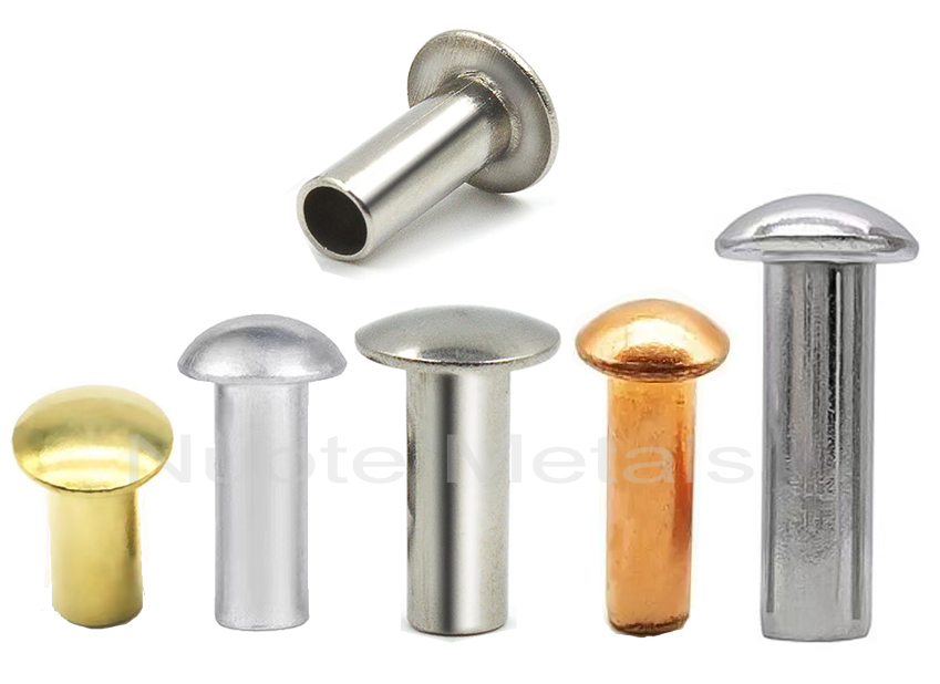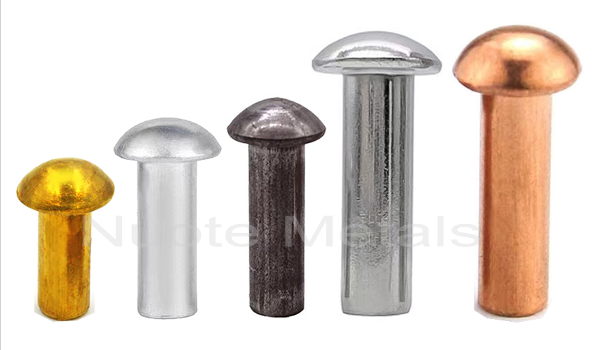 หมุดย้ำ, เห็ดหัวหมุดแข็ง, หัวหมุดแข็งหัวหมุดหัวมัดหัวหมุดแข็ง, หมุดย้ำหมุดย้ำที่เป็นสากลหัวในวัสดุที่แตกต่างกันเช่นทองเหลือง, เหล็ก (เหล็ก), สแตนเลส, อลูมิเนียม, ทองแดง